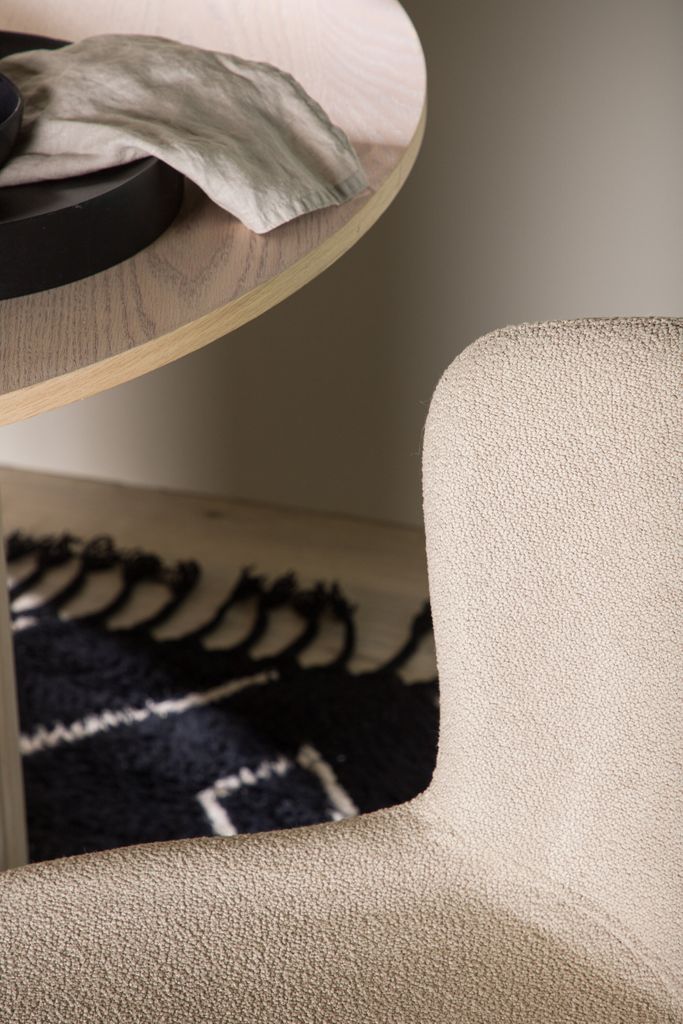 - Design: Stolarna är klädda i mjukt beige bouclétyg som ger ett stilrent och modernt uttryck.