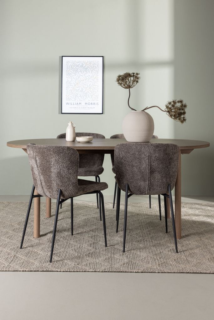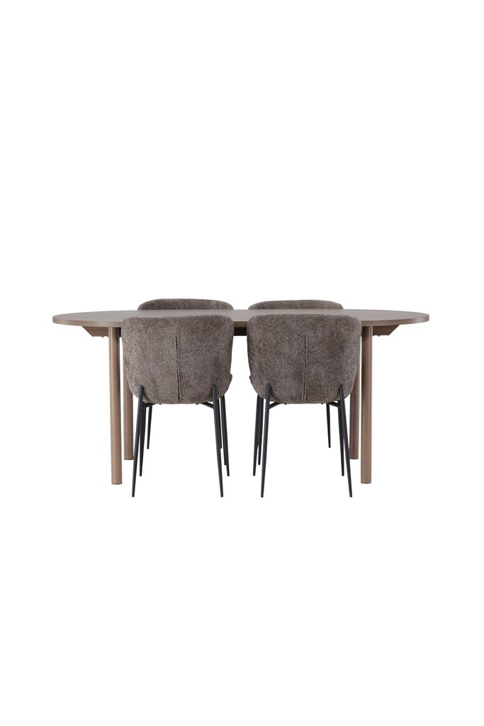 Modern och stilren matgrupp med ovalt bord i mörkbrun MDF och lurviga grå stolar.