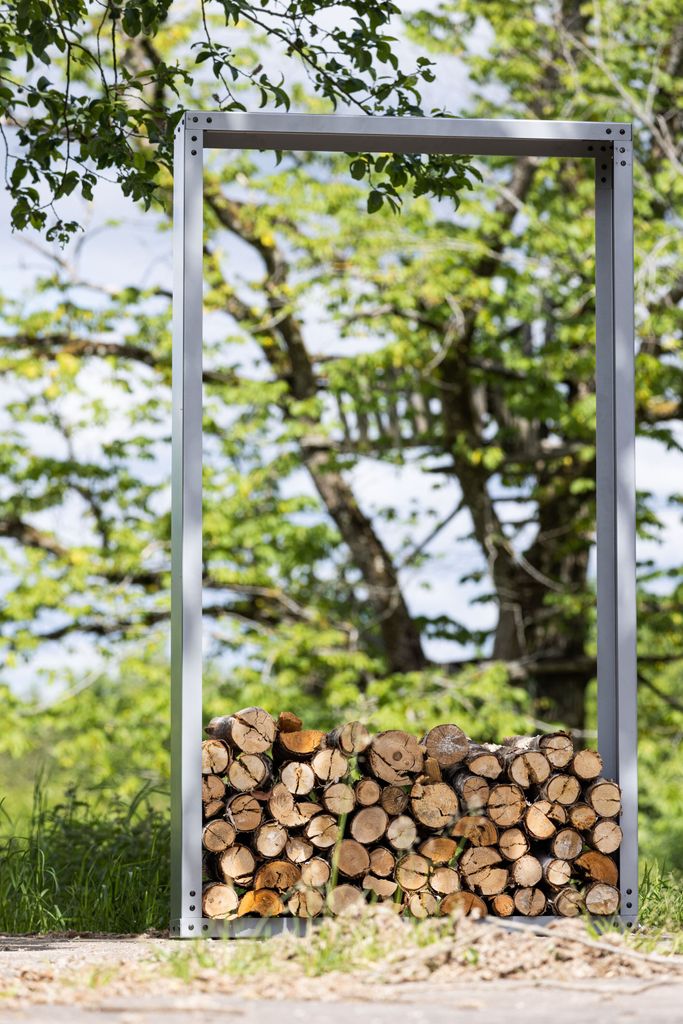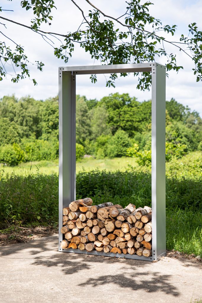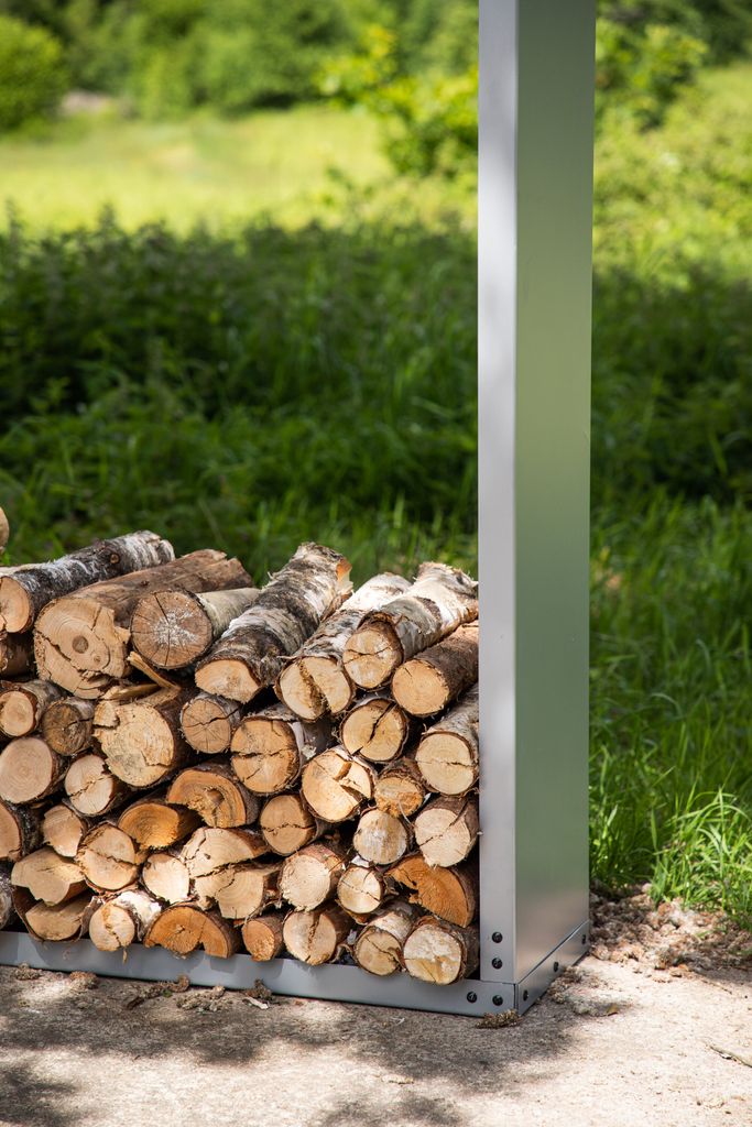 Elegant och praktisk vedstaplare i silvrigt stål, perfekt för uteplatsen. Enkel att montera och passar i de flesta inredningsstilar.