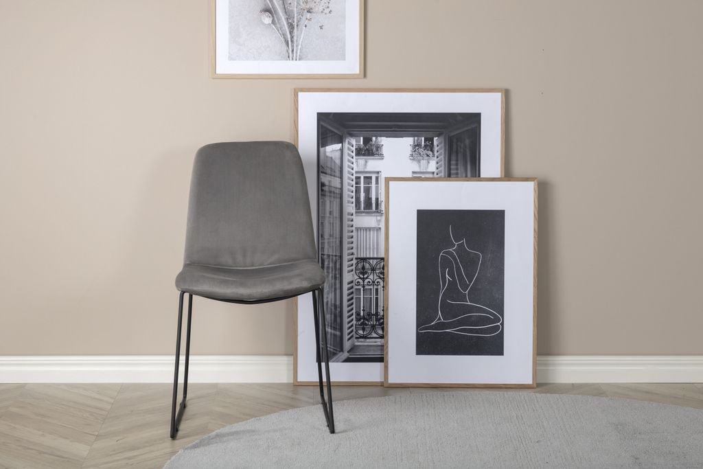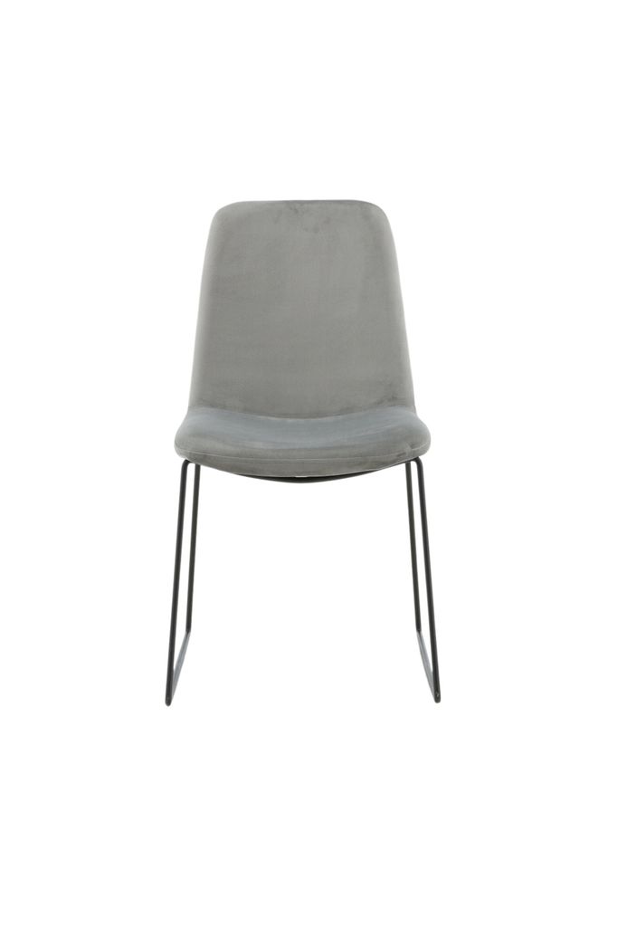 Elegant och tidlös matstol i grå sammet med svart metallben. Perfekt för stilrena måltider.