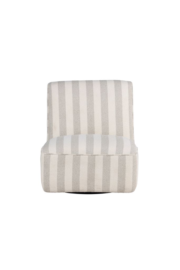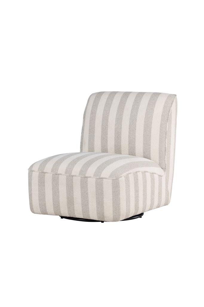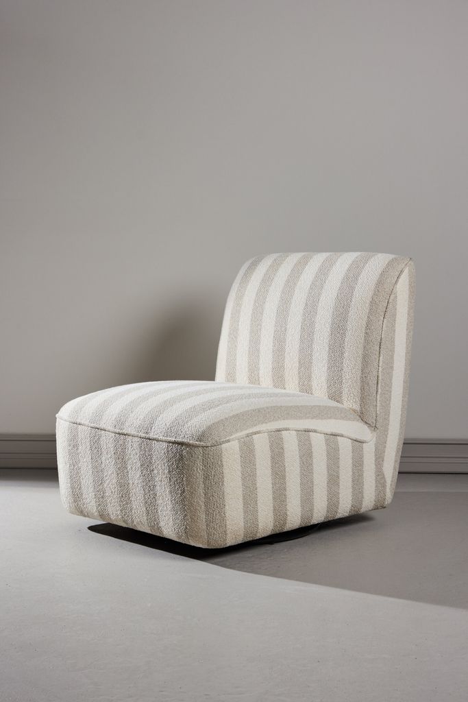 Elegant loungestol utan armstöd med breda, vita och beiga ränder. Perfekt för avkoppling i alla rum.