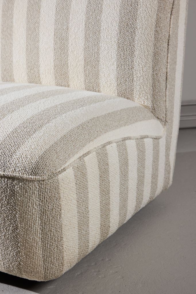 Den kläs i ett elegant textil med breda vita och beiga ränder, vilket ger den ett lekfullt men ändå sofistikerat uttryck. Den avskalade formen gör den perfekt för både vardagsrum, sovrum eller hallen i det moderna hemmet.