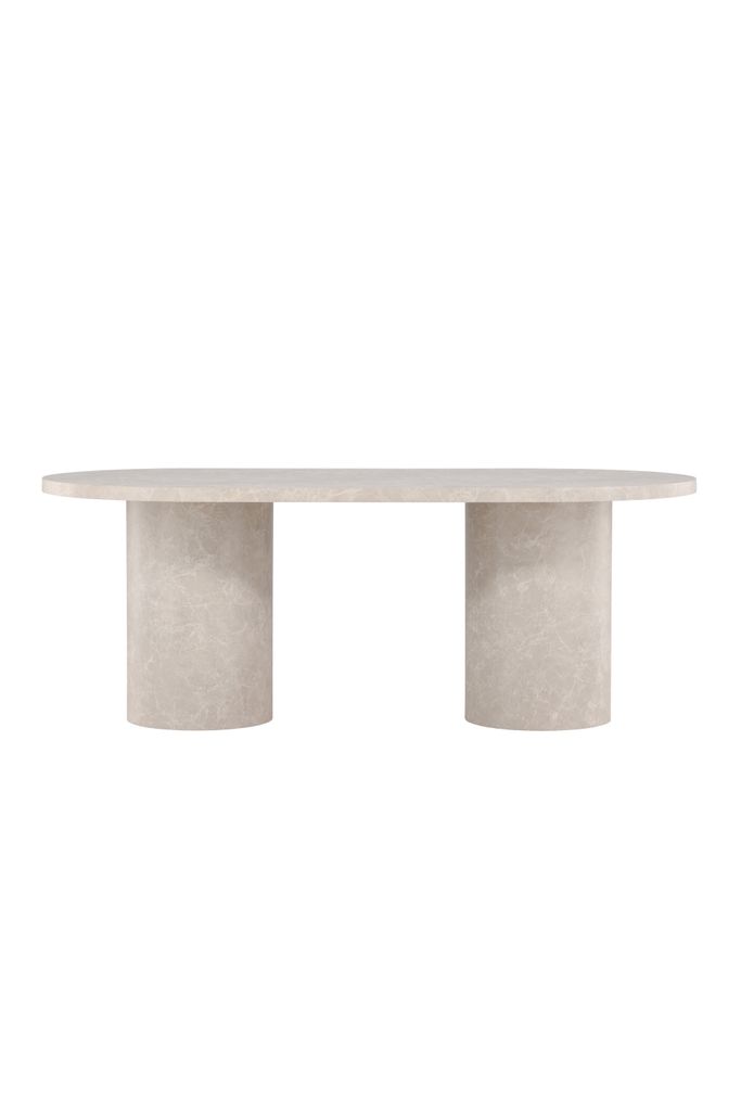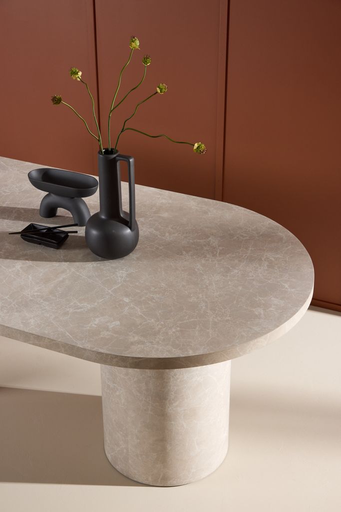 Sofistikerat matbord med elegant beige marmorkänsla, perfekt för både vardag och fest.