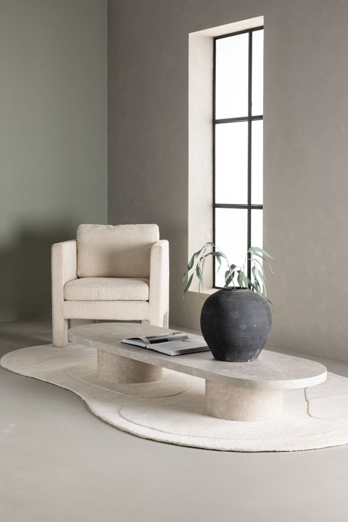 Bordet har en rundad design och enkla linjer som ger en känsla av lugn och harmoni. De två cylindriska benen i beige skapar en stabil och stilren bas. Den släta bordsskivan erbjuder gott om plats för böcker, tidningar eller dekorativa föremål, vilket gör det både praktiskt och estetiskt tilltalande.