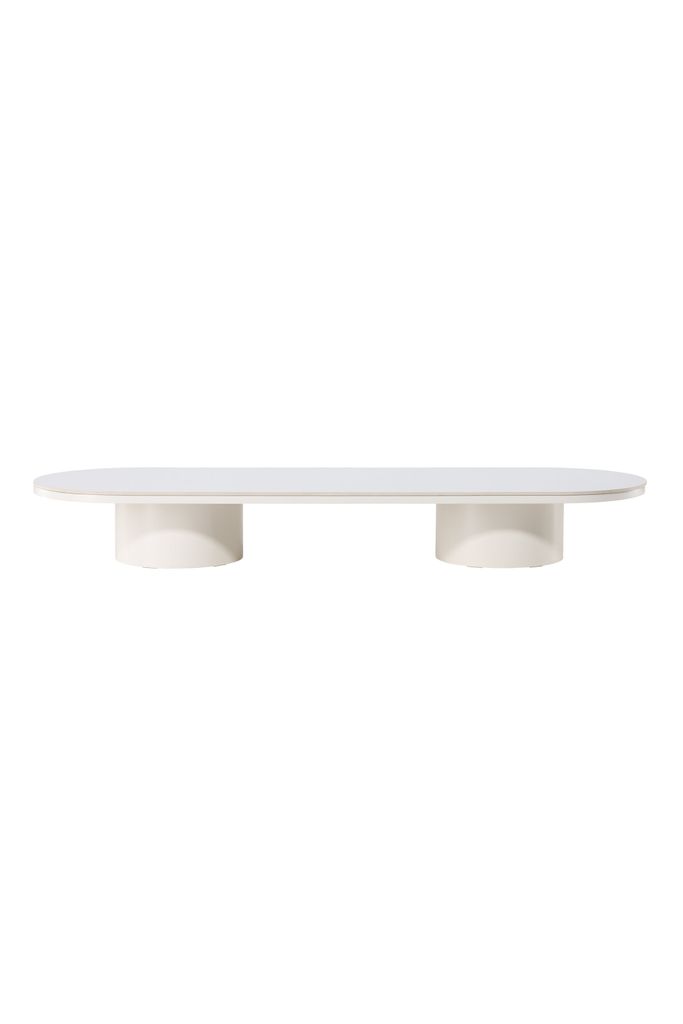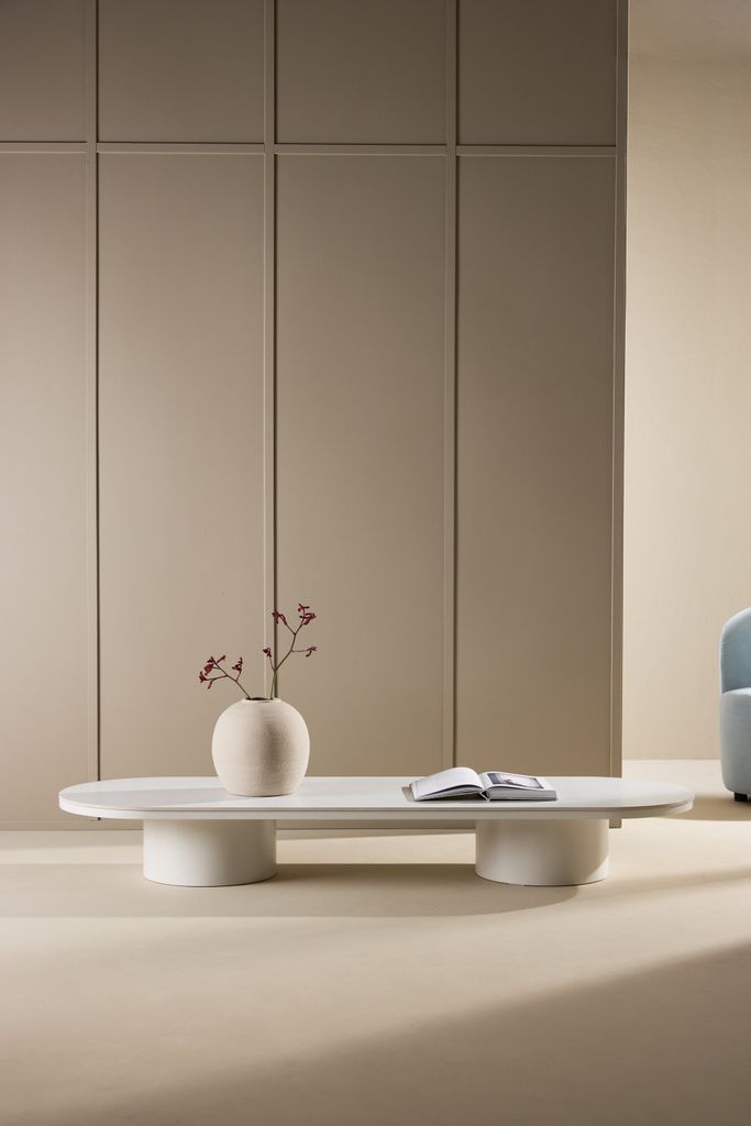 Soffbordet har en låg design, vilket bidrar till en avslappnad och inbjudande känsla i vardagsrummet. Den eleganta skivan vilar på två robusta, runda ben som harmoniserar perfekt med bordets övergripande minimalistiska estetik. Denna möbel smälter lätt in i olika inredningsstilar, från modern minimalism till skandinavisk enkelhet.