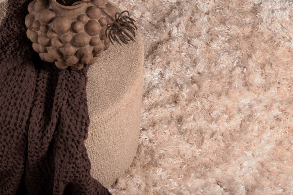 Fluffig champagnefärgad matta i polyester med silkeslen känsla och hög lugg, perfekt för alla rum.