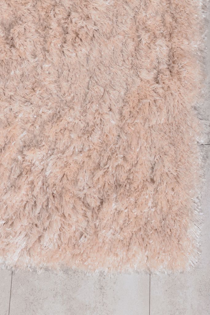 Glansfull och slitstark matta i beige polyester, perfekt för sovrum eller vardagsrum med hög lugg och skimrande lyster.
