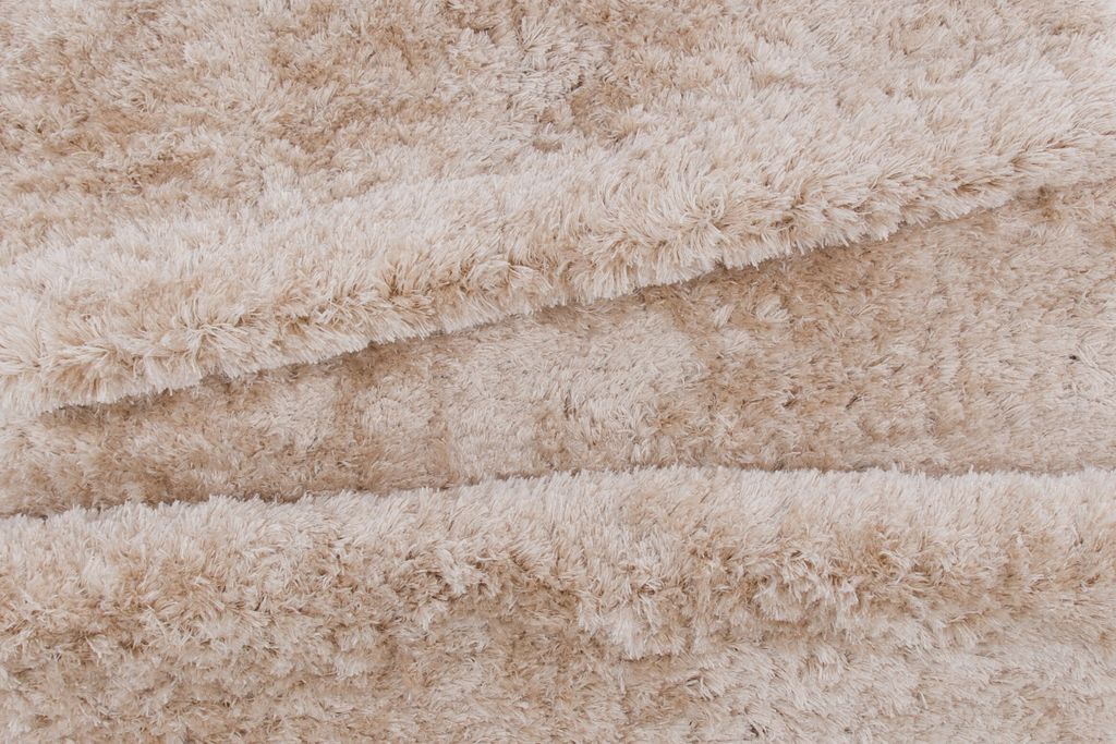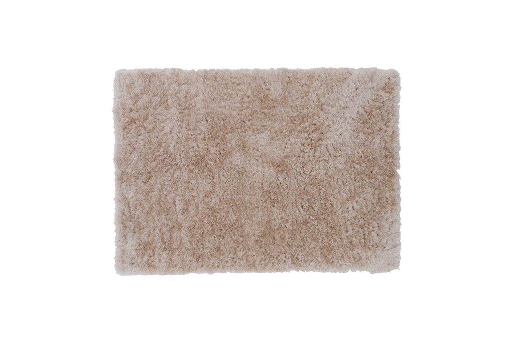 Fluffig champagnefärgad matta i polyester med silkeslen känsla och hög lugg för ett sofistikerat intryck.