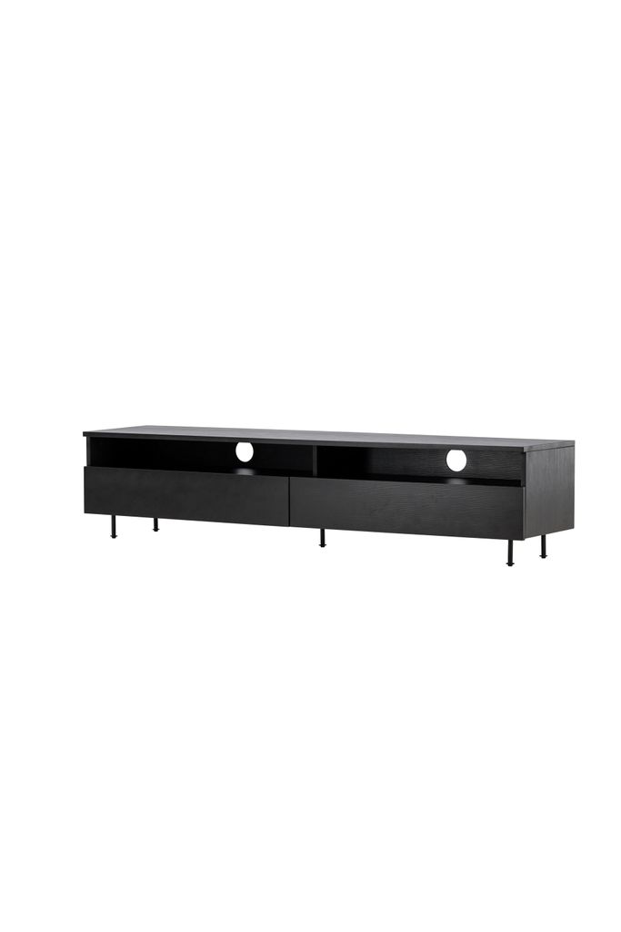Svart TV-bänk i skandinavisk stil med rymliga lådor och öppna hyllor för smart förvaring och stilren inredning.
