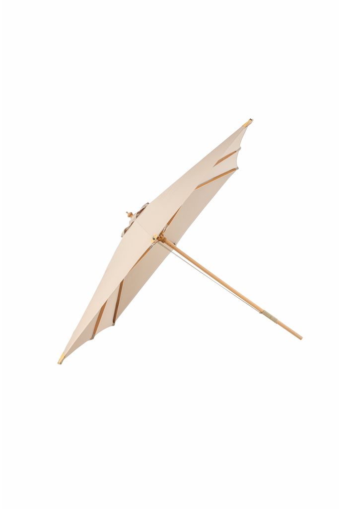 Elegant parasoll i jordnära brun med trästomme, idealisk för både skugga och stil vid dina utemöbler.