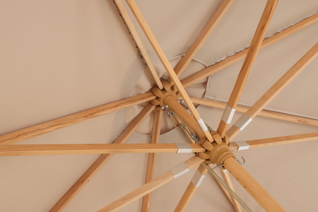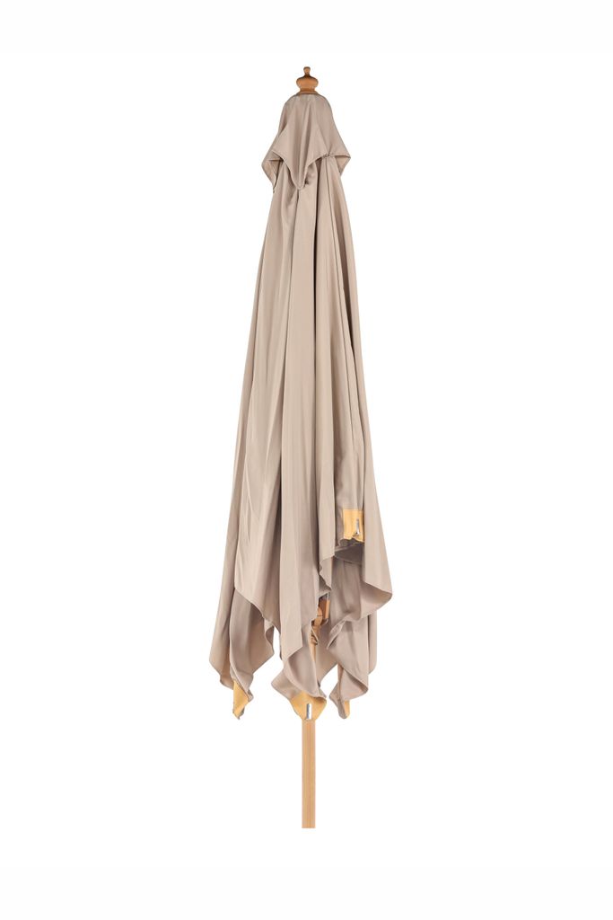 Den stilfulla stommen är tillverkad av trä, vilket ger en robust och hållbar struktur samtidigt som den tillför en touch av elegans. Det breda 3x3m tyget ger generöst med skugga, och dess höga design gör det enkelt att justera efter solen.