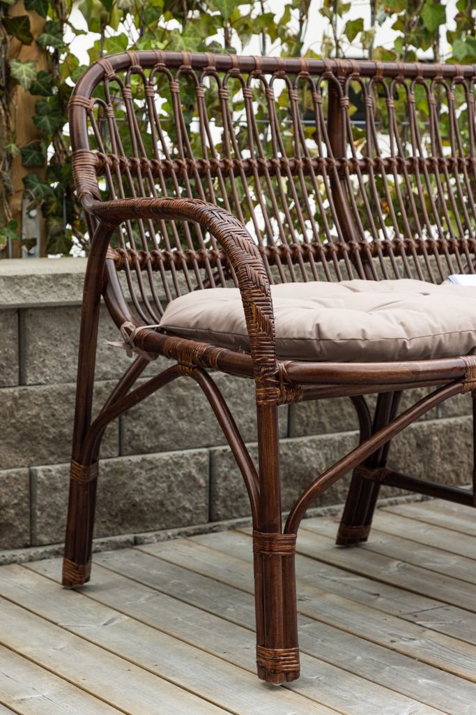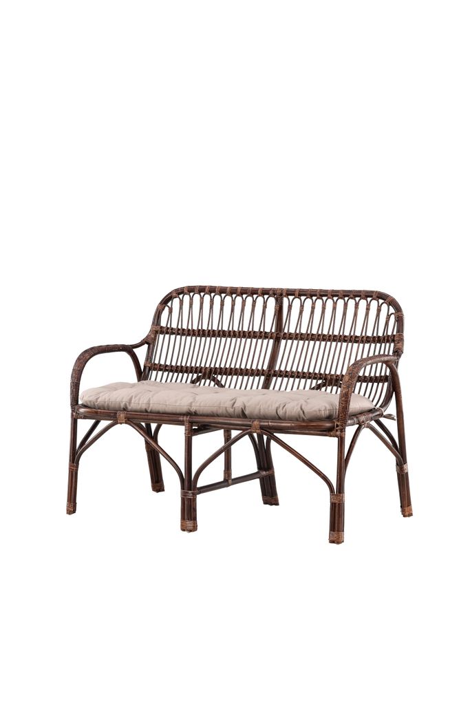Skapa en avslappnad atmosfär utomhus med Nella 2-sits rottingsoffa i brun nyans med beige dynor.