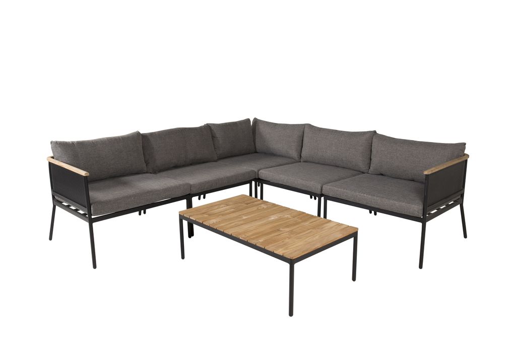 Modern hörnsoffgrupp för uteplats i svart metall och teak, med grå dynor och flexibel design.