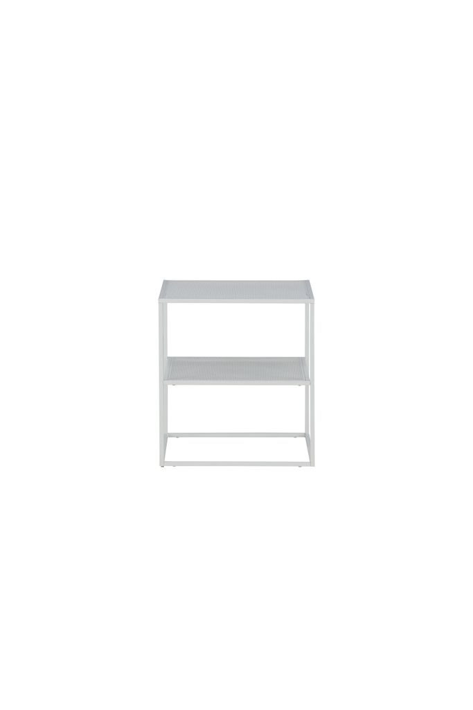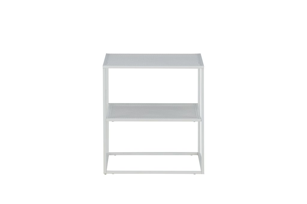 Modernt vit sidobord i stål med industriell design och praktiskt hyllplan för förvaring.
