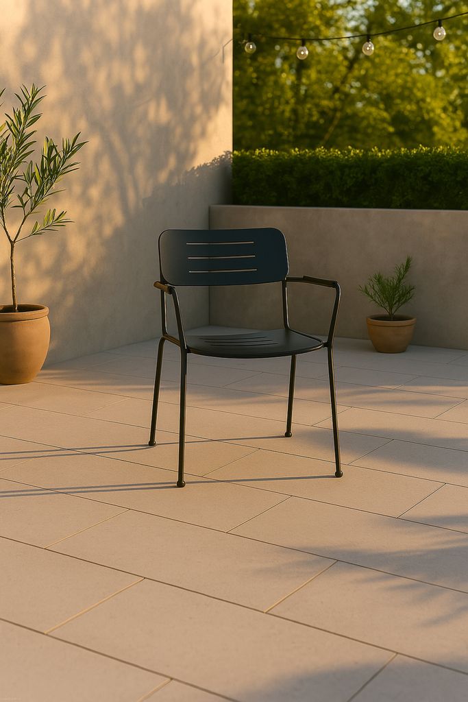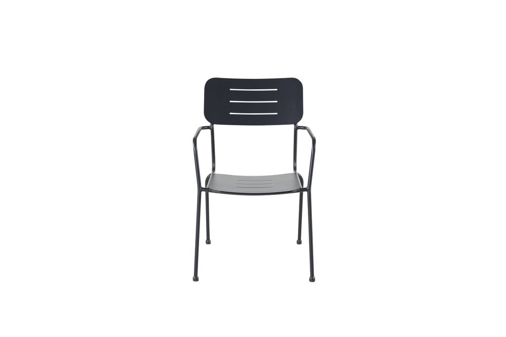 Elegant och stapelbar matstol i svart stål, perfekt för utomhusbruk. Enkel att kombinera med olika bord.