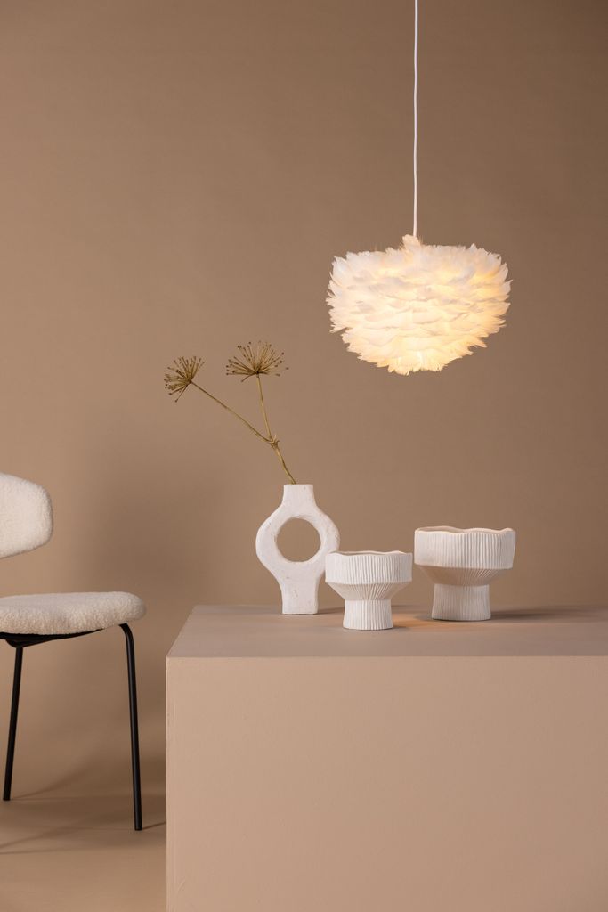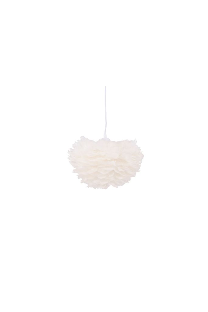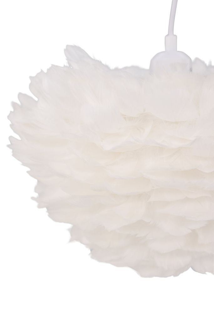 Stilfull taklampa med vita fjädrar för en mjuk och ombonad känsla. Perfekt för sov- eller vardagsrum.