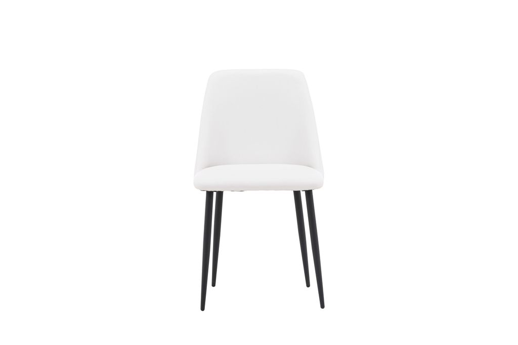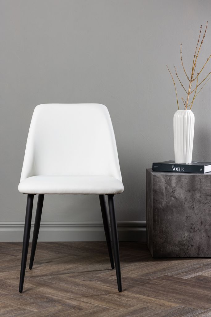 Elegant matstol i skandinavisk design med vit PU-klädsel och svarta stålben. Komfort och stil i ett.