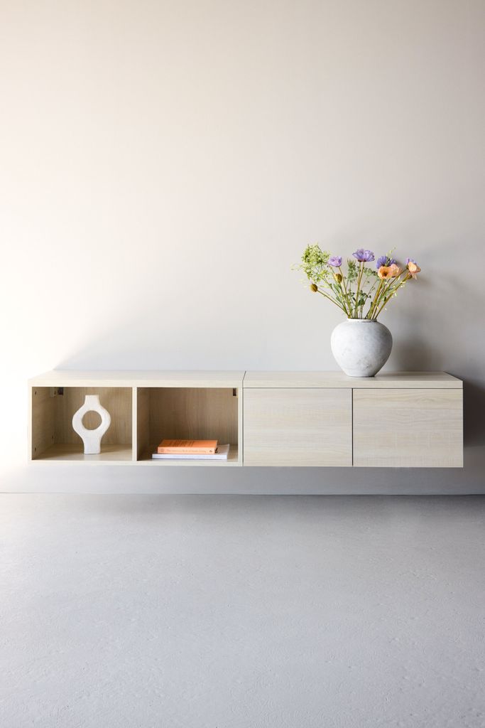 Modern TV-bänk med ljus vitvättad finish, erbjuder smart förvaring och stilren design för det moderna hemmet.