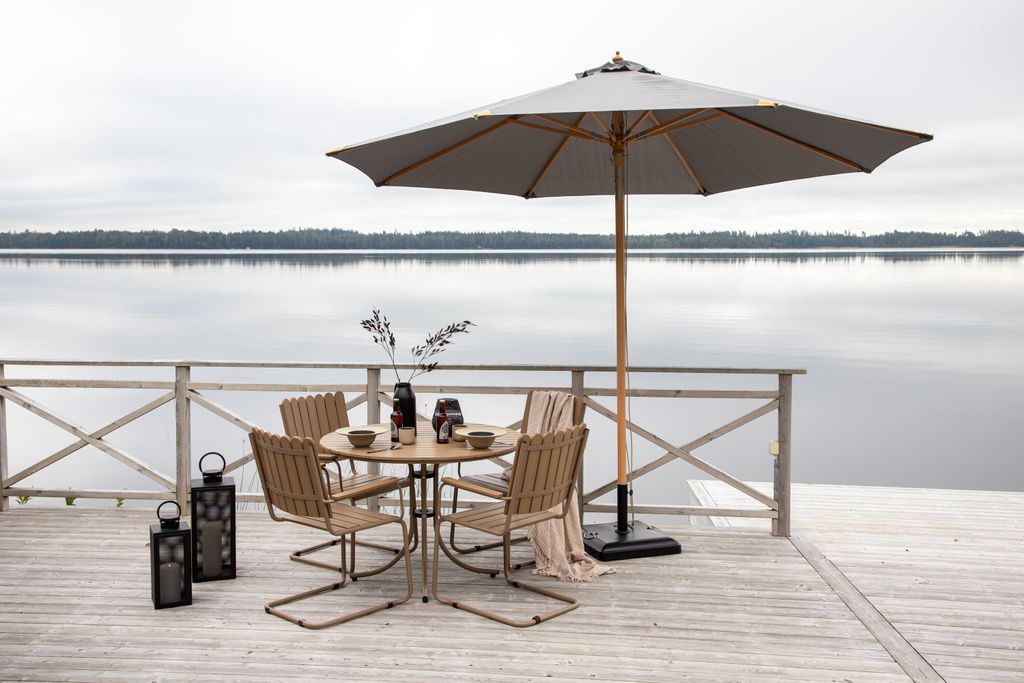 Skydda dig från solen med det stilrena Nypo parasollet i grått tyg och träställning - perfekt för alla utemiljöer.