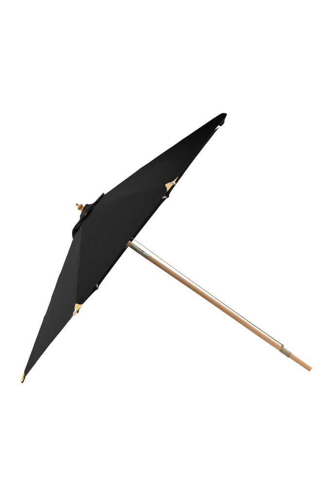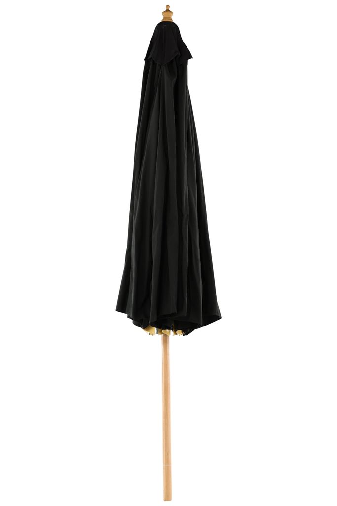 Elegant parasoll med tidlös design i svart tyg och träställning. Perfekt för utomhusbruk.