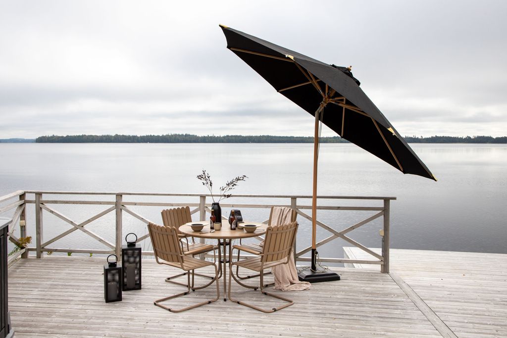 Bjud in familj och vänner till en härlig utomhuslunch eller njut av skuggan under Venture Home Nypo Parasoll. Med sitt moderna och tidlösa uttryck passar detta parasoll perfekt i alla trädgårdar och uteplatser. Det svarta tyget i kombination med den robusta träställningen skapar en elegant kontrast som fångar blickarna.