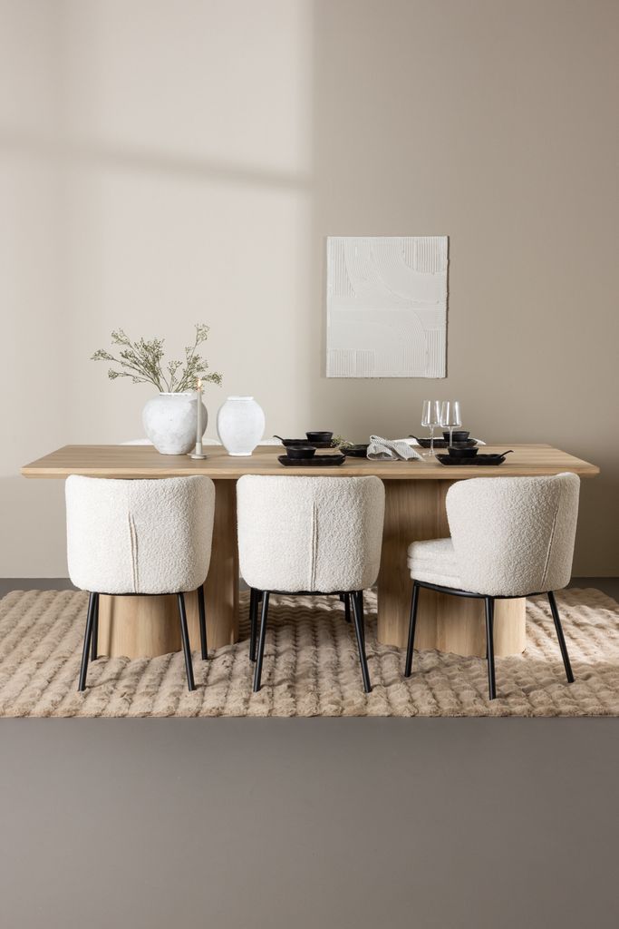 Elegant matgrupp med vit bouclé-stolar och vitvättat bord för stil och komfort i ditt hem.