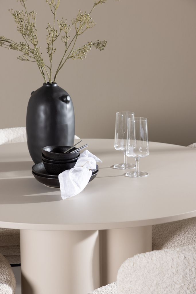 Matbordet Olivia, tillverkat av MDF, har en ljus beige färg som tillför en varm och inbjudande känsla till ditt matrum. Med en diameter på 110 cm erbjuder bordet gott om plats för mat och samtal, samtidigt som dess runda form skapar en balanserad och social miljö. Bordets robusta konstruktion säkerställer långvarig användning och stabilitet.
