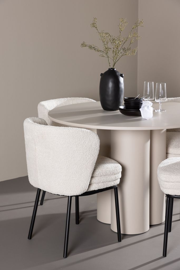 De fyra Agnes-stolarna kompletterar bordet perfekt med sina eleganta sitsar klädda i vit boucle. Dessa stolar erbjuder både komfort och stil, vilket gör dem idealiska för långa, njutbara middagar med familj och vänner. Deras moderna design med hög ryggstöd och mjuka sitsar ger ditt matrum en sofistikerad och samtida touch. Stolarna har svarta, slanka ben som kontrasterar fint mot de ljusa sitsarna.