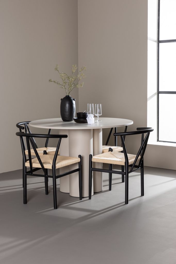 De fyra Alfons-stolarna kompletterar bordet perfekt med sina eleganta sitsar i beige rotting och stilrena ben i svart metall. Dessa stolar erbjuder både komfort och stil, vilket gör dem idealiska för långa, njutbara middagar med familj och vänner. Deras moderna design med hög ryggstöd och naturliga material ger ditt matrum en sofistikerad och samtida touch.