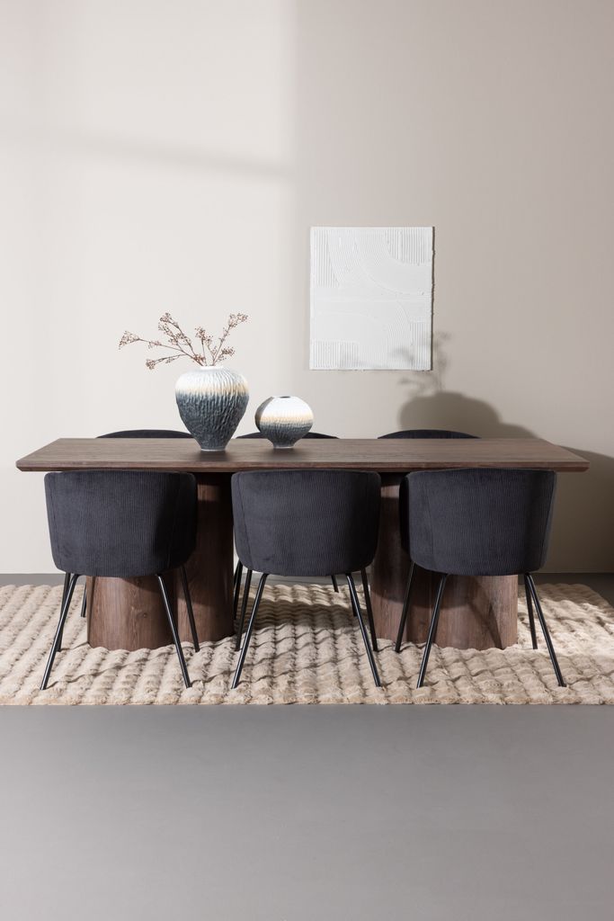 Berit Matstol kompletterar bordet med sin eleganta svarta velvet-klädsel och stilrena svarta stålben. Stolen bjuder in till lyxig komfort med sin breda sits, perfekt för långa samtal och trivsamma måltider. Dess moderna uttryck och distinkta karaktär gör den till en central del i varje matrum. Kombinationen av det mockafärgade bordet och de svarta stolarna skapar en elegant och harmonisk look.