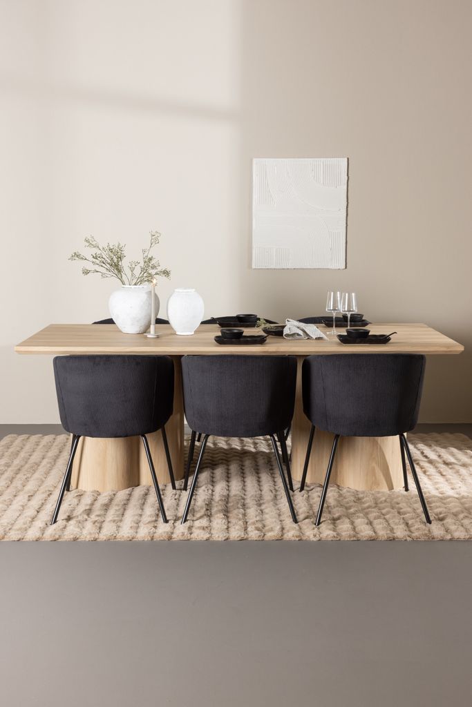 Elegant matgrupp med svart velvet-stolar och ett vitvättat bord, perfekt för stilfulla måltider.