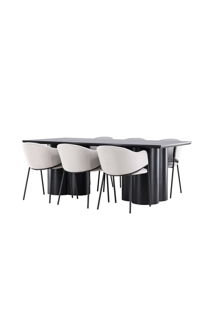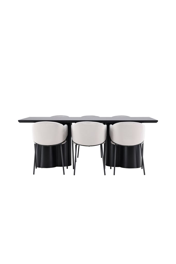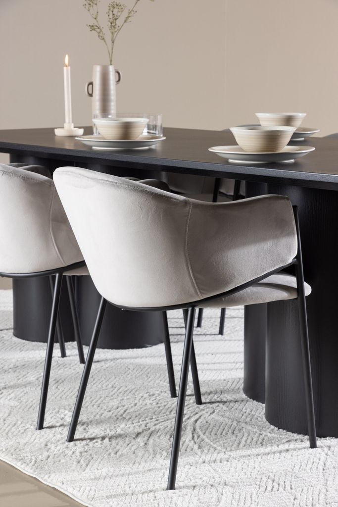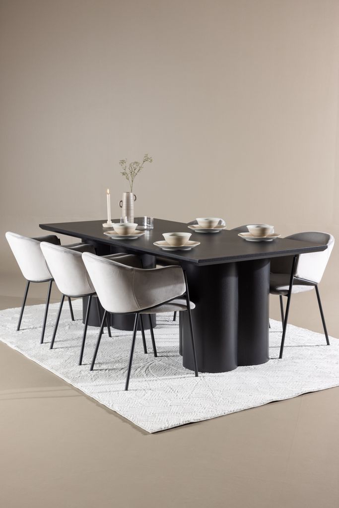 Olivia matbordet, med sina generösa mått på 210x100 cm, har en sofistikerad svart nyans som utstrålar modernitet medan dess robusta konstruktion garanterar långvarig stabilitet. Kombinationen av bordets eleganta design och stolarnas bekväma sitsar ger ditt matrum en känsla av lyx och modernitet.