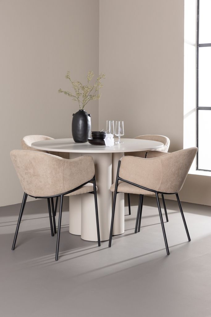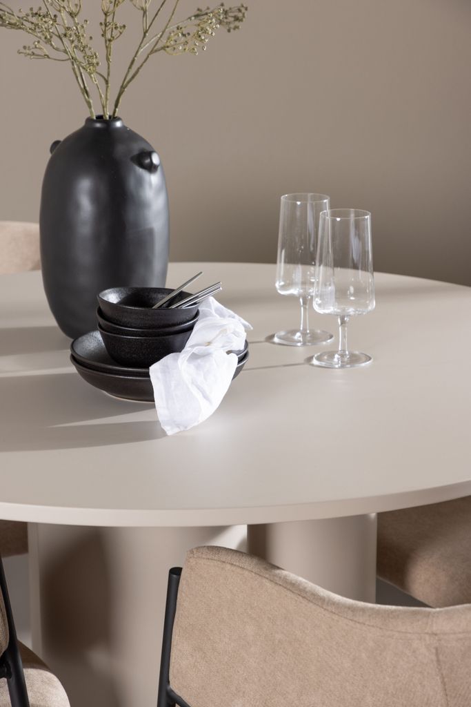 Matbordet Olivia är tillverkat av högkvalitativ MDF och har en ljus beige färg som ger ett varmt och inbjudande intryck. Med en diameter på 110 cm erbjuder detta bord gott om utrymme för både mat och samtal. Dess runda form bidrar till en balanserad och social miljö, och den robusta konstruktionen garanterar både stabilitet och långvarig användning.