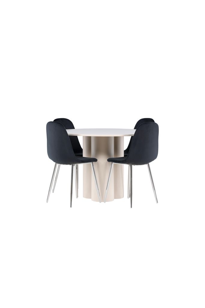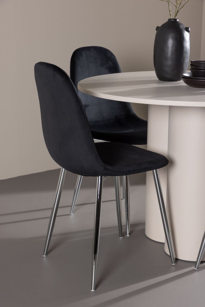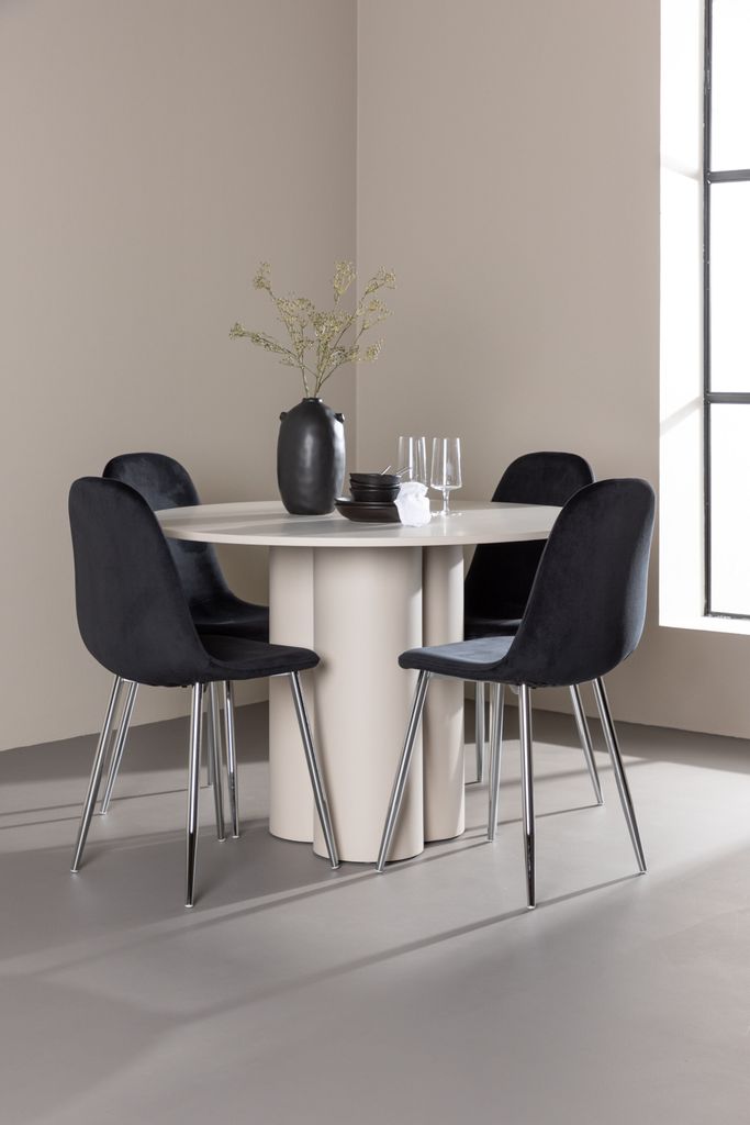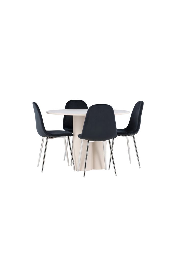 Stilfull matgrupp med Olivia-bord i beige MDF och eleganta Polar-stolar i svart sammet. Perfekt för moderna hem.