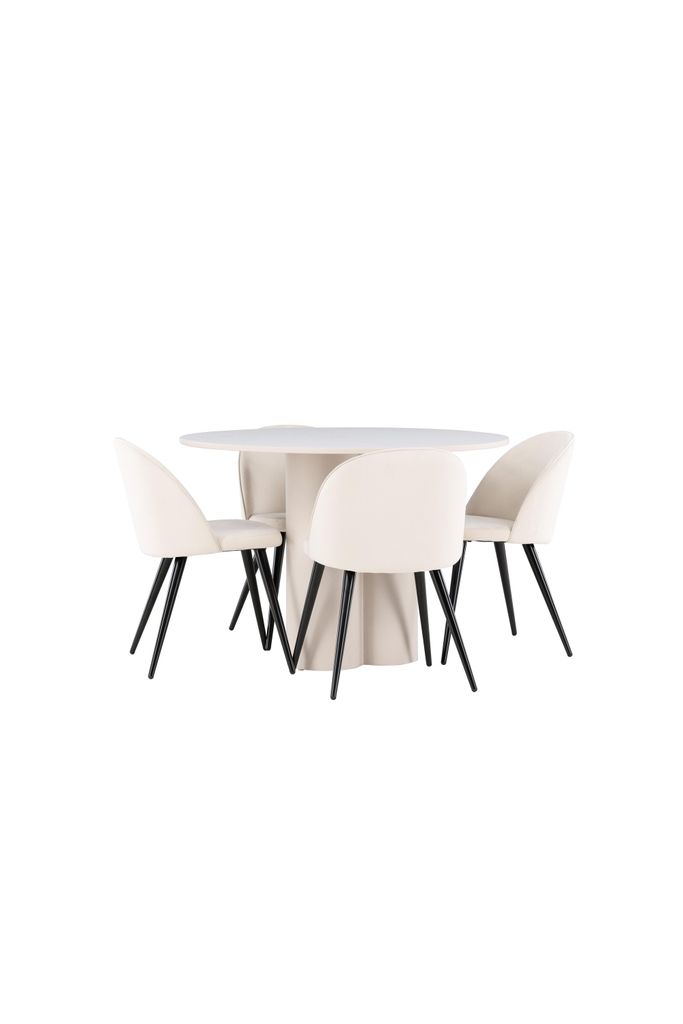 Skapa en elegant matplats med Olivia bord och lyxiga Velvet-stolar i beige sammet för en modern och sofistikerad atmosfär.