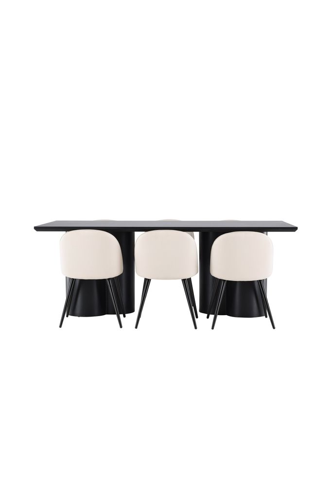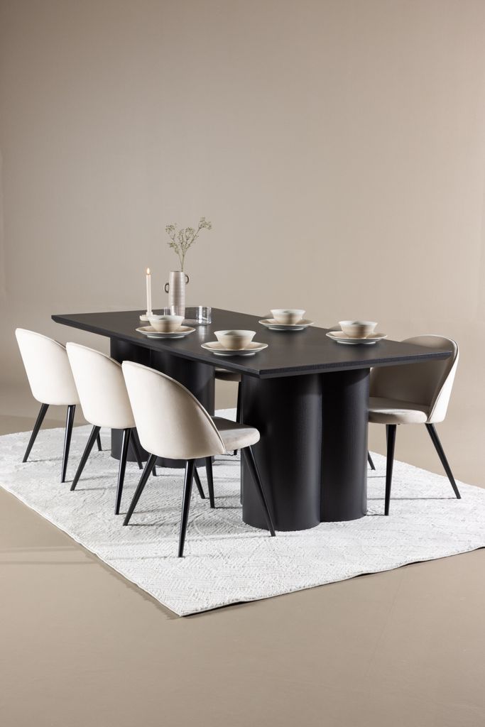 Elegant matgrupp med Velvet matstolar i beige sammet och svart Olivia matbord. Perfekt för stilrena måltider.