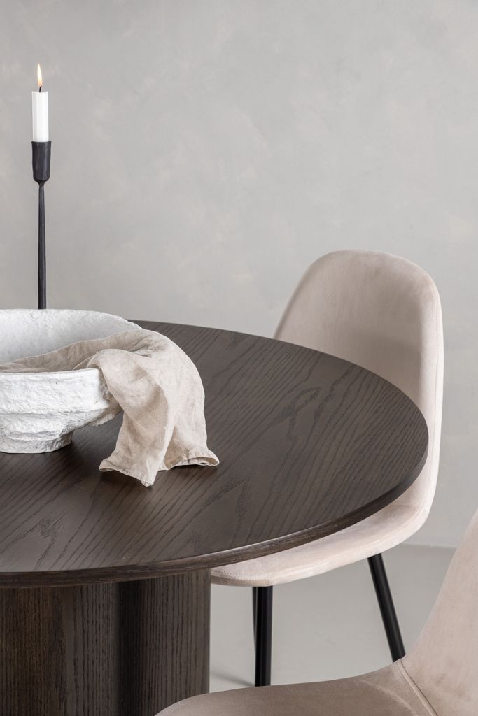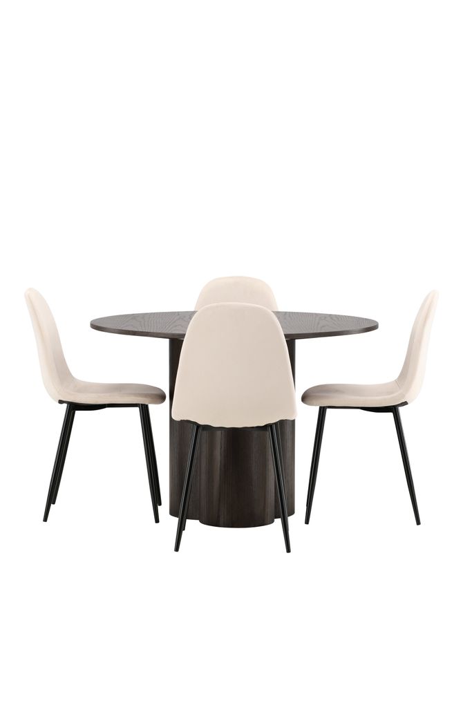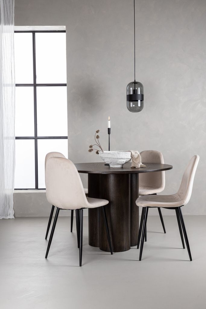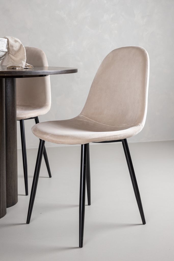 Medföljer är de bekväma Polar matstolarna, klädda i mjukt beige sammetstyg. Deras rundade rygg och sits med mjuk stoppning ger utmärkt komfort. Stolarna står stadigt på svarta pulverlackerade metallben, vilket skapar en harmonisk kontrast till de ljusa textilierna.