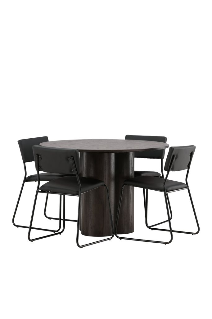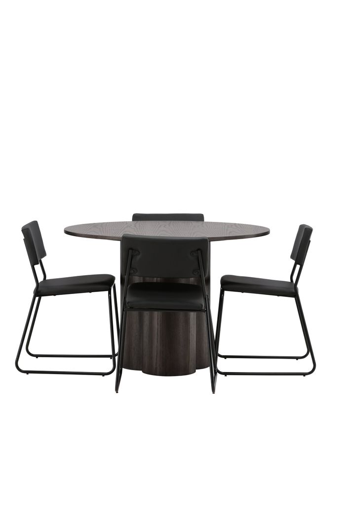 De medföljande matstolarna Kenth kompletterar bordet perfekt med sin minimalistiska och moderna design. Stolarna skapar en luftig känsla i rummet med sin rygg och sits i svart polyuretanskinn och polyester, medan de smala benen av järn ger ett stilrent intryck.