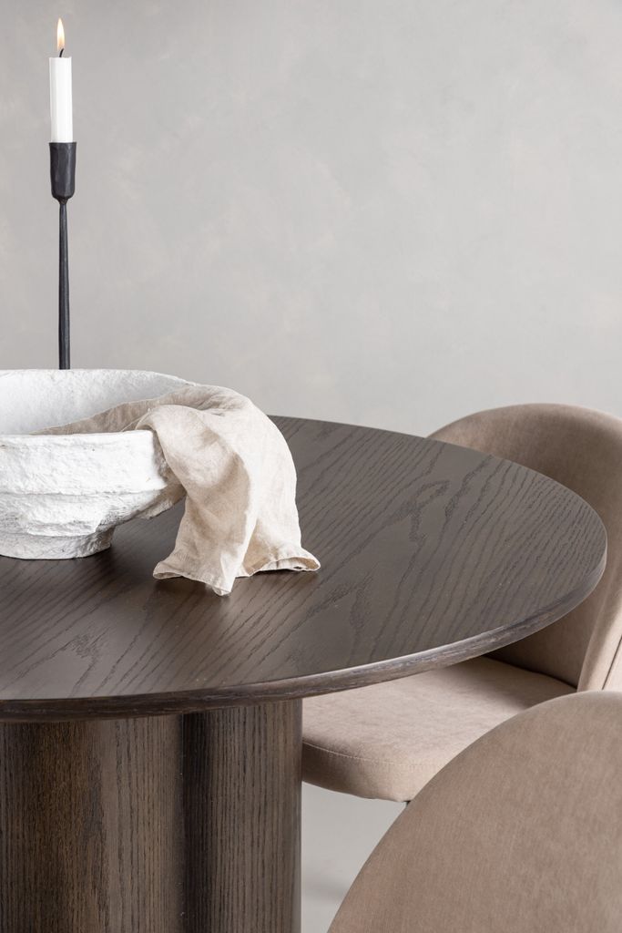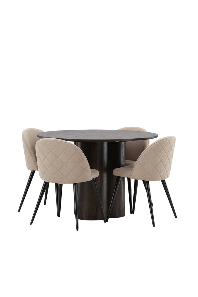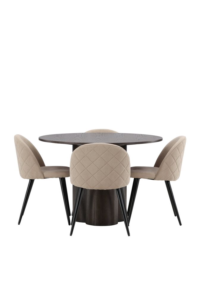 Elegant rund matgrupp i skandinavisk design med moccakulört bord och bekväma stolar i beige polyestertyg.