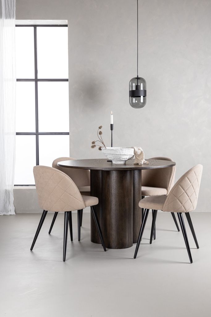Kompletterande till bordet är de stilfulla matstolarna från serien Velvet Stitches. Stolarna har en helklädd design med en lätt rundad rygg och sits i beige polyestertyg som erbjuder både komfort och elegans. De svarta pulverlackerade metallbenen ger en modern kontrast och stabilitet.