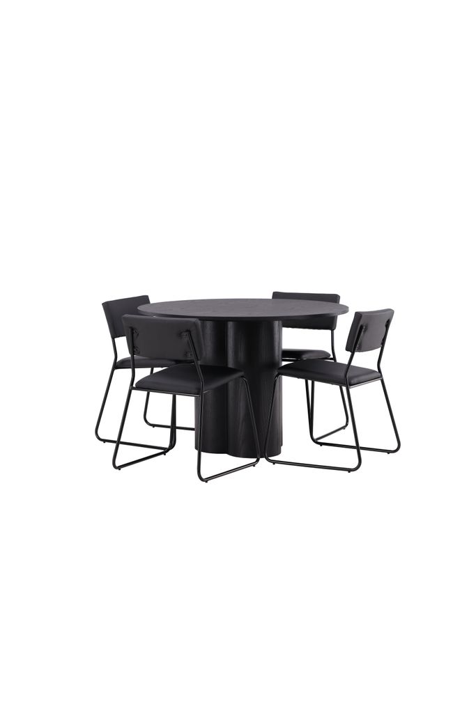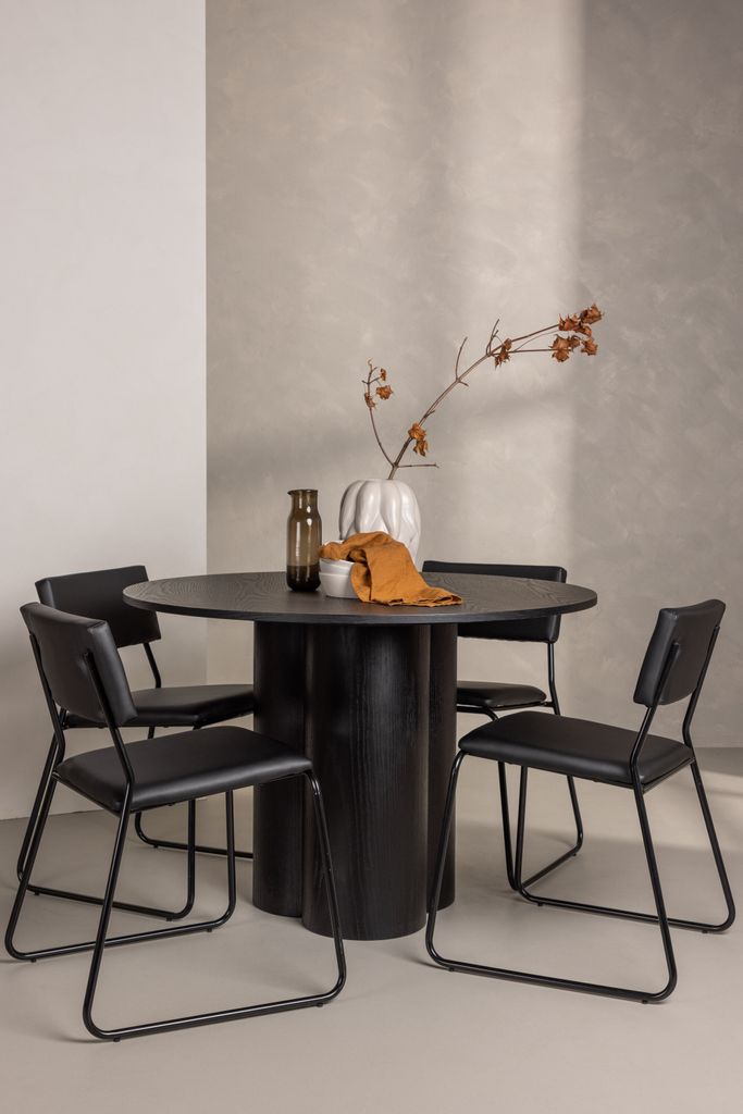 Elegant matgrupp med skandinavisk design i svart MDF och polyuretanskinn. Perfekt för moderna hem.