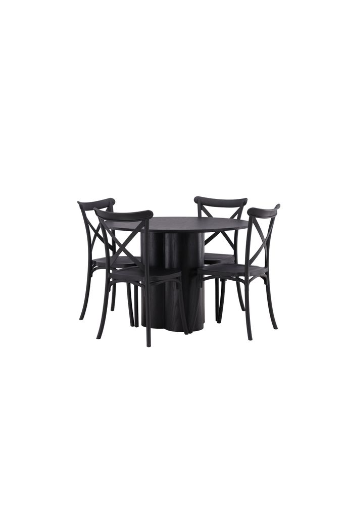 Stilren matgrupp med svart matbord i MDF och klassiska Crosett-stolar i matt plast. Perfekt för moderna hem.