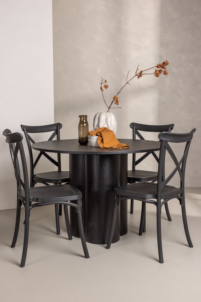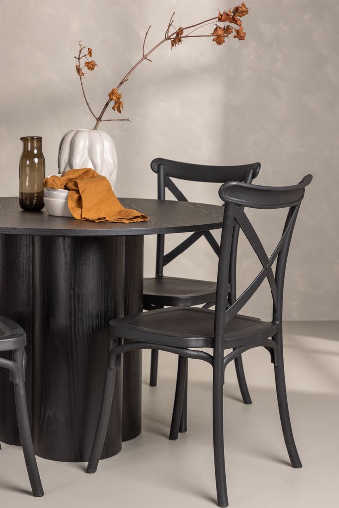 Stolarna från Crosett-serien är tillverkade i mattsvart plast, vilket gör dem både hållbara och lättskötta. Deras klassiska utformning harmoniserar perfekt med bordets moderna design, vilket skapar en sammanhållen och inbjudande atmosfär.