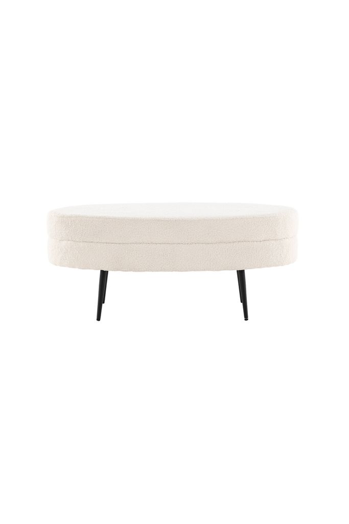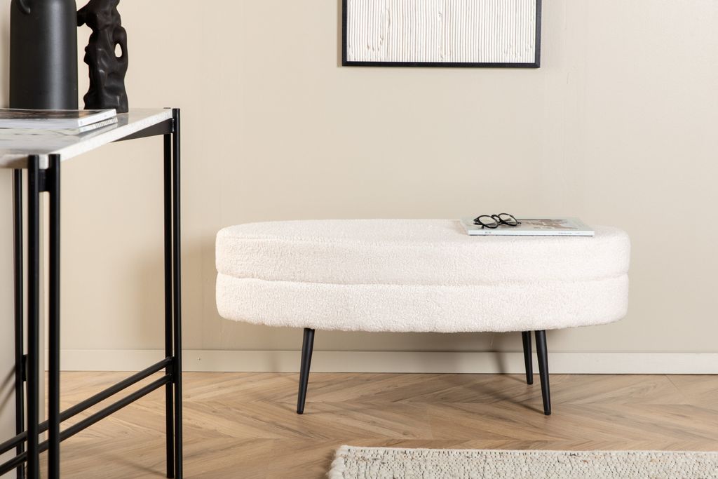 Elegant sittpuff i benvit teddytyg med svart stålben, perfekt för extra sittplats eller som inredningsdetalj.