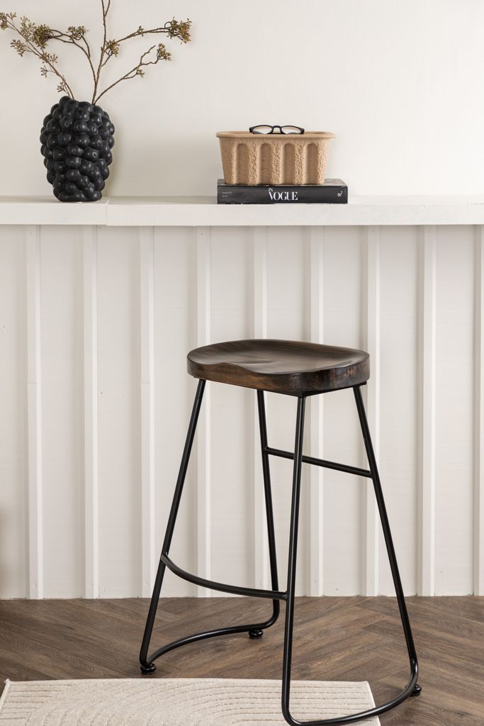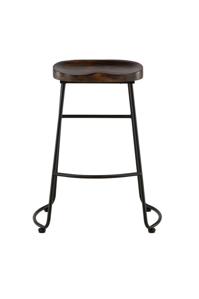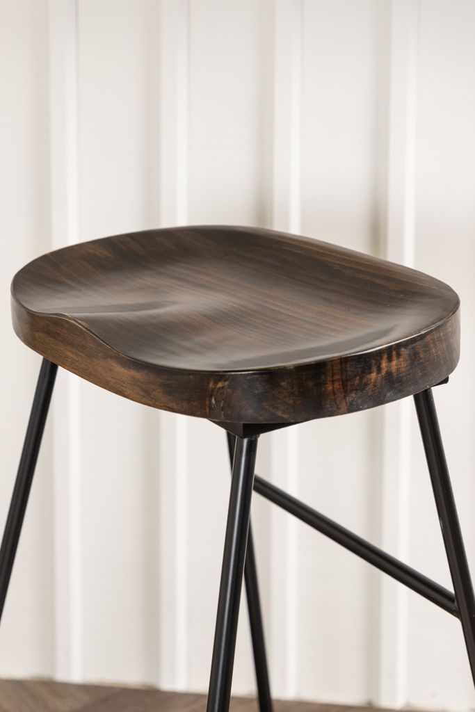 Elegant barstol med mörk träsits och stabilt svart stålunderrede. Perfekt för stilfullt och bekvämt sittande.