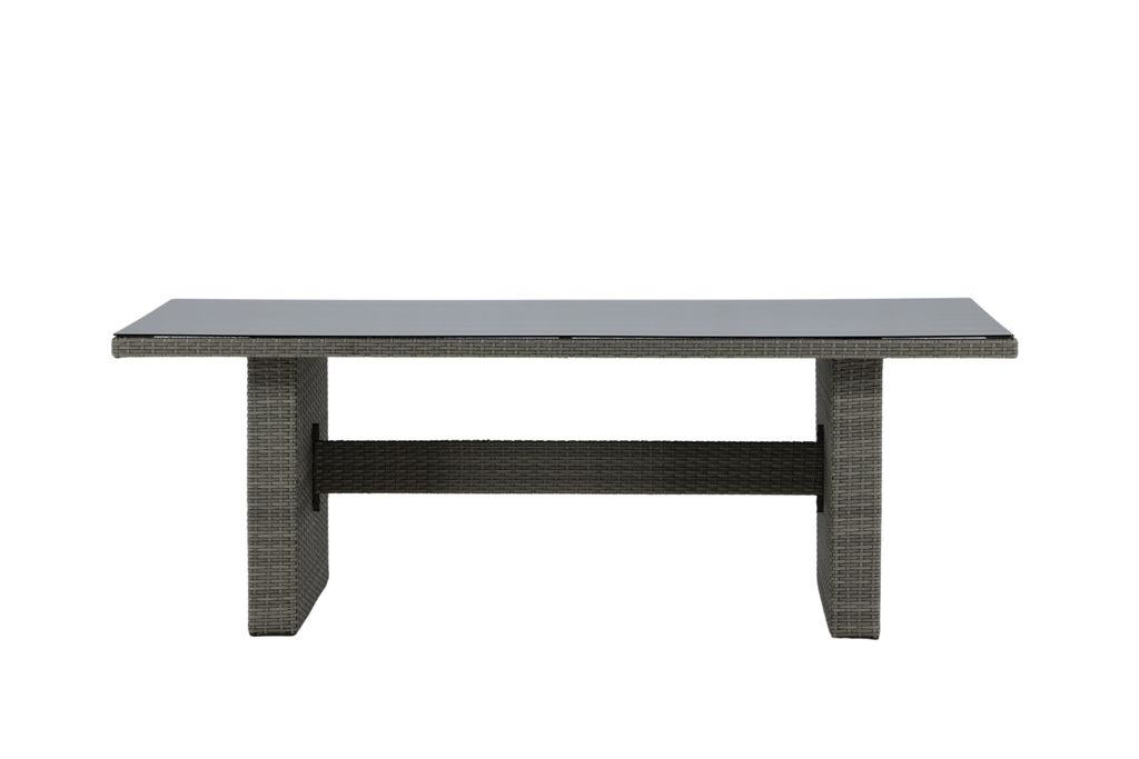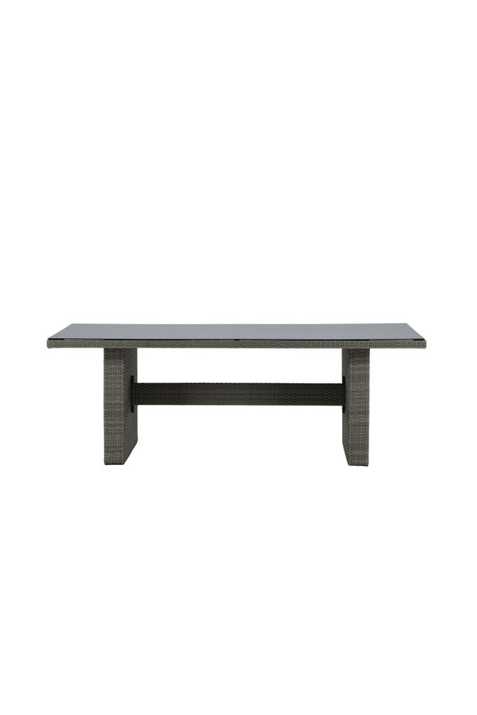 Med sina generösa mått på 200 x 100 cm erbjuder bordet gott om utrymme för trevliga middagar med familj och vänner. Den grå färgen på konstrottingen kompletterar glasets elegans och gör det enkelt att matcha med andra utemöbler.
