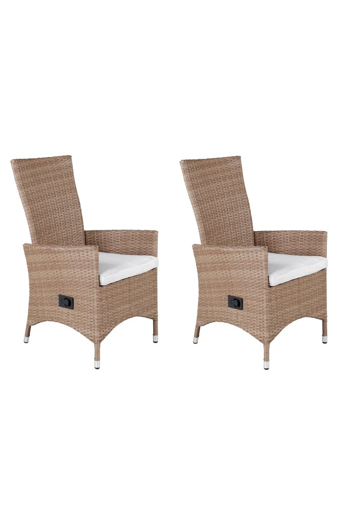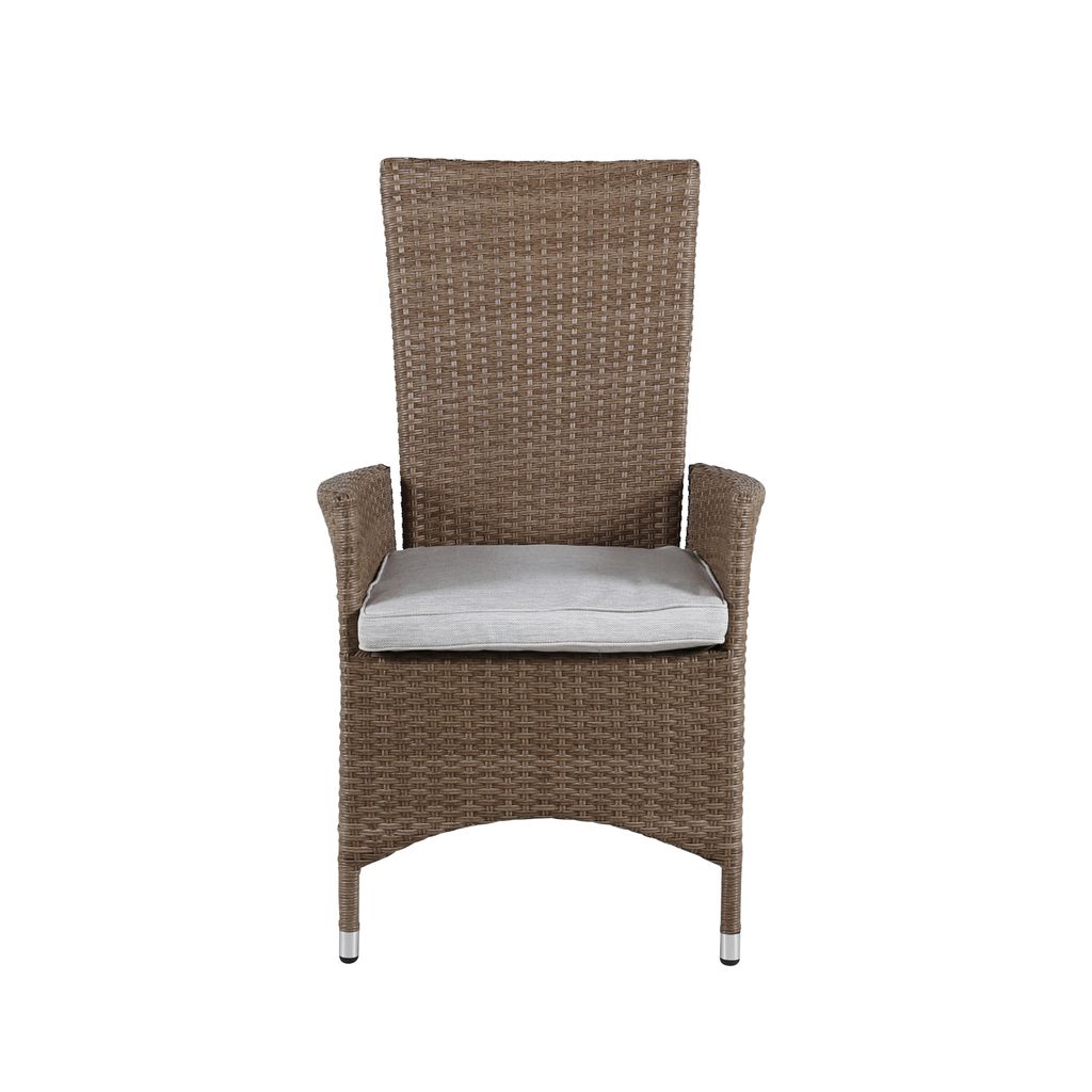 Bekväm matstol i sandfärgad konstrotting med fällbart ryggstöd och aluminiumstomme. Perfekt för uteplatsen.