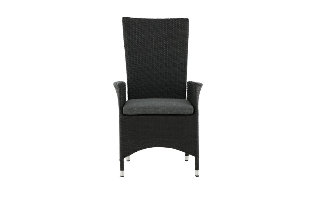 Komfortabel och stilren matstol i svart konstrotting med fällbart ryggstöd och aluminiumstomme.