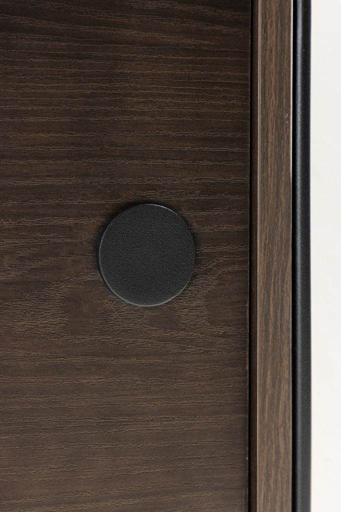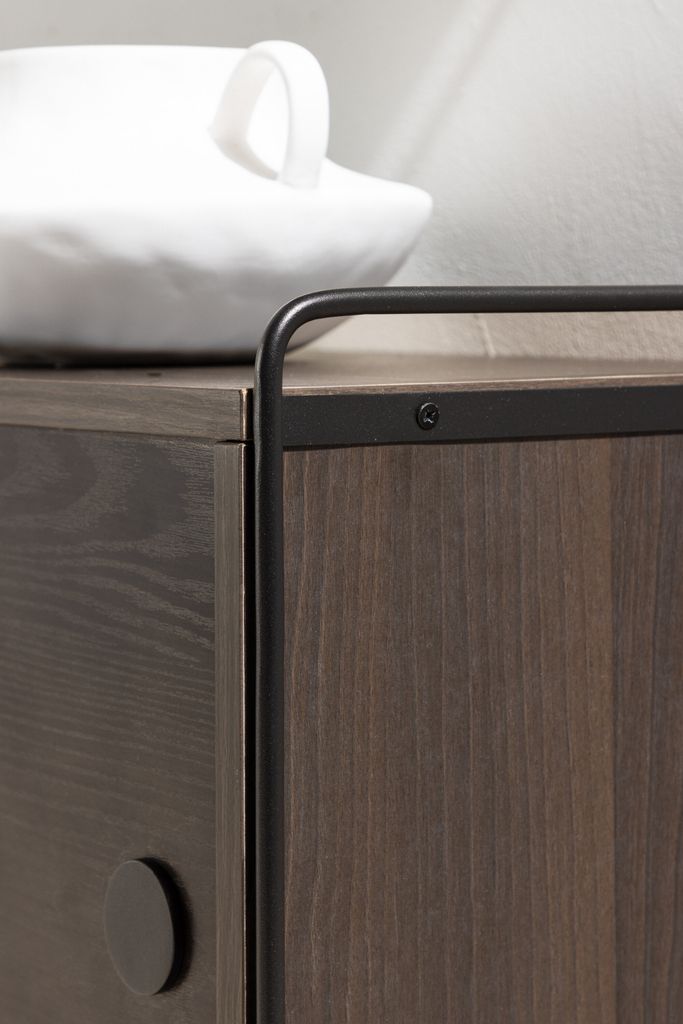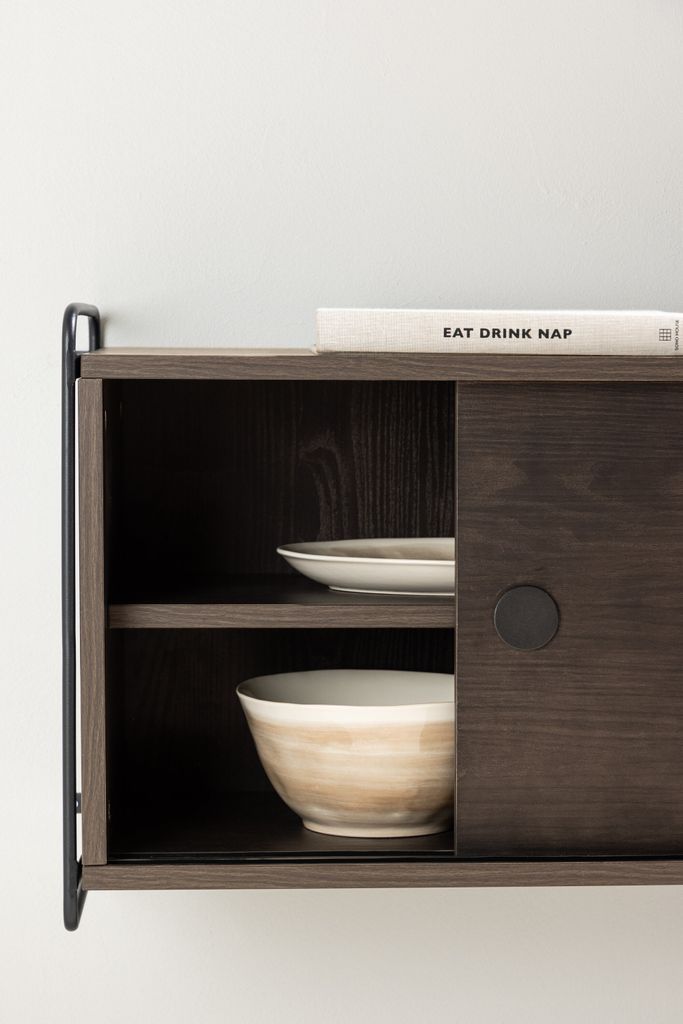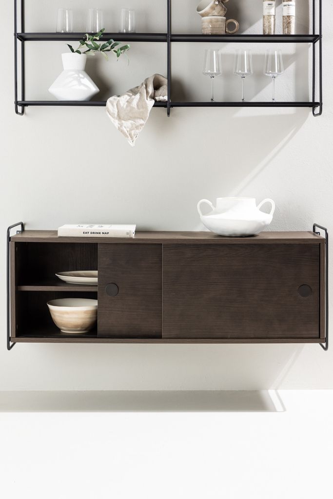 Trendig vägghylla i mörkbrunt trä och svart stålram med två eleganta luckor för stilfull och dold förvaring.