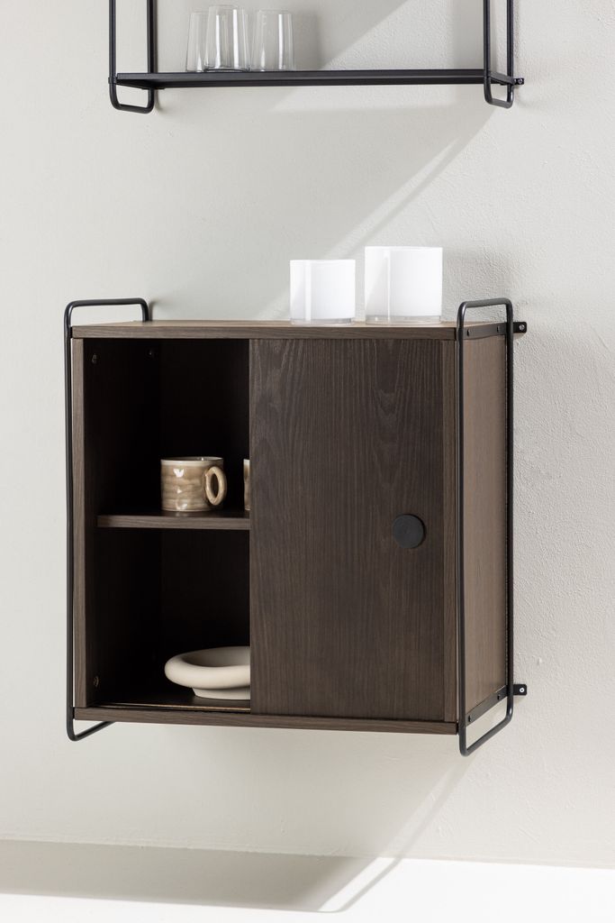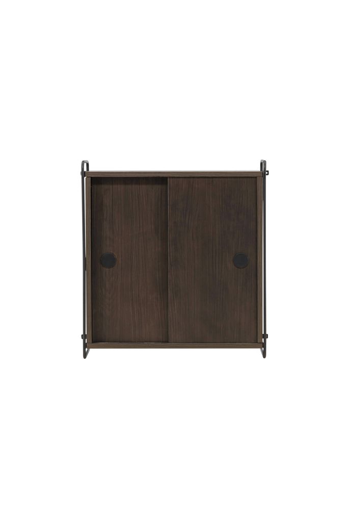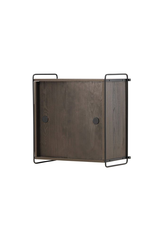 Trendig vägghylla i mörkbrunt trä med svart stålram. Två luckor och hyllplan för smart förvaring.
